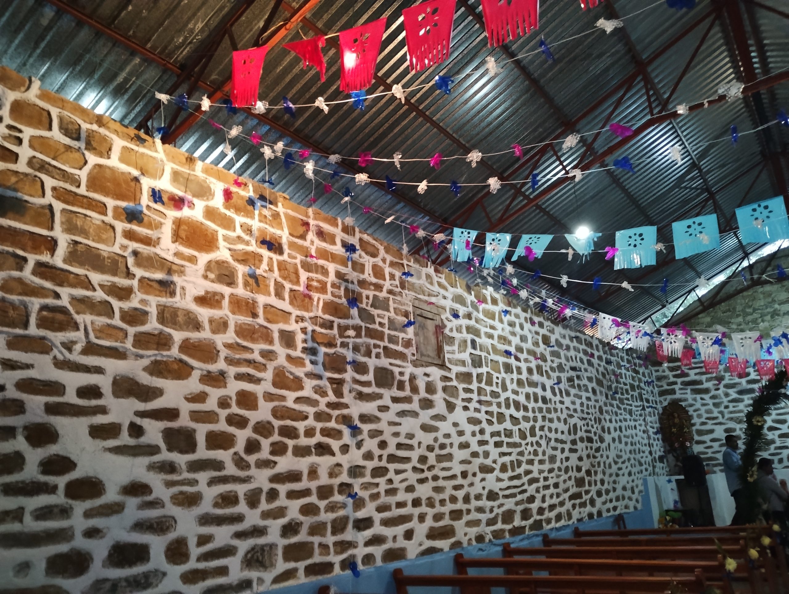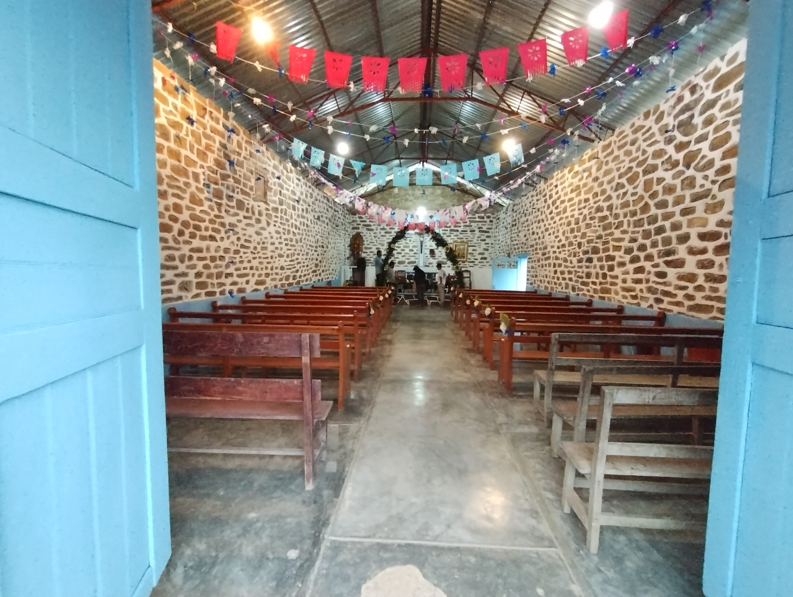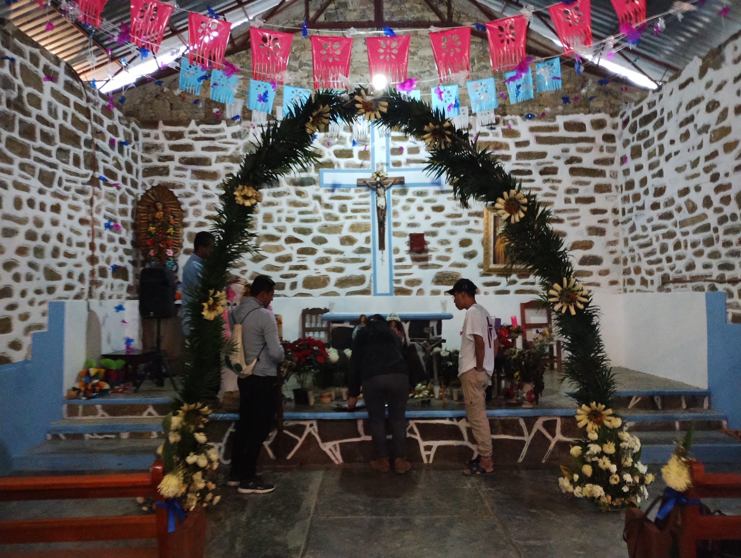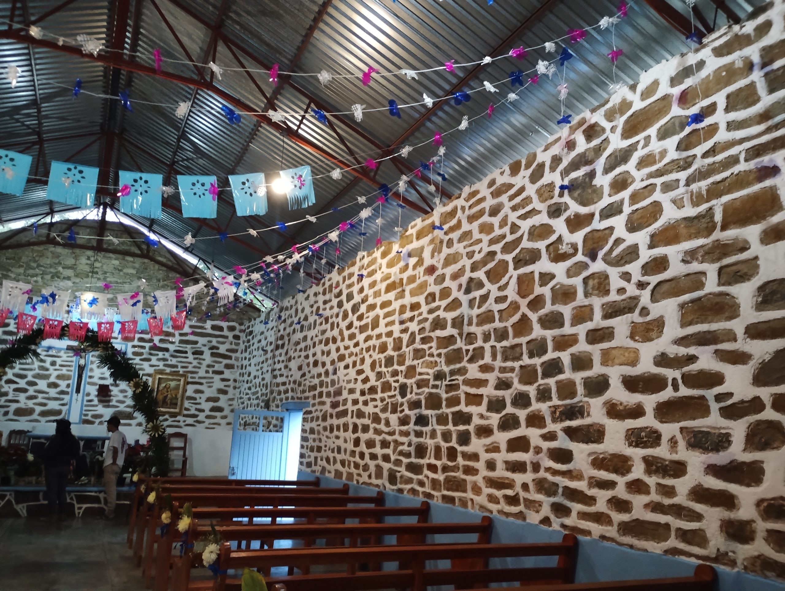 DESCRIPCIÓN ARQUITECTÓNICA. Su forma es una nave rectangular, sus muros perimetrales son de piedra de la region, su techado es de forma triangular (dos aguas), sus pisos son de concreto pulido color gris. En el año 2015 gente de la comunidad decidieron realizar unas columnas al exterior del templo, en ellas descansan unas armaduras de acero que son las que reciben las laminas galvanizadas. al exterior del templo se encuentra el campo santo (panteón).