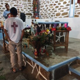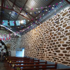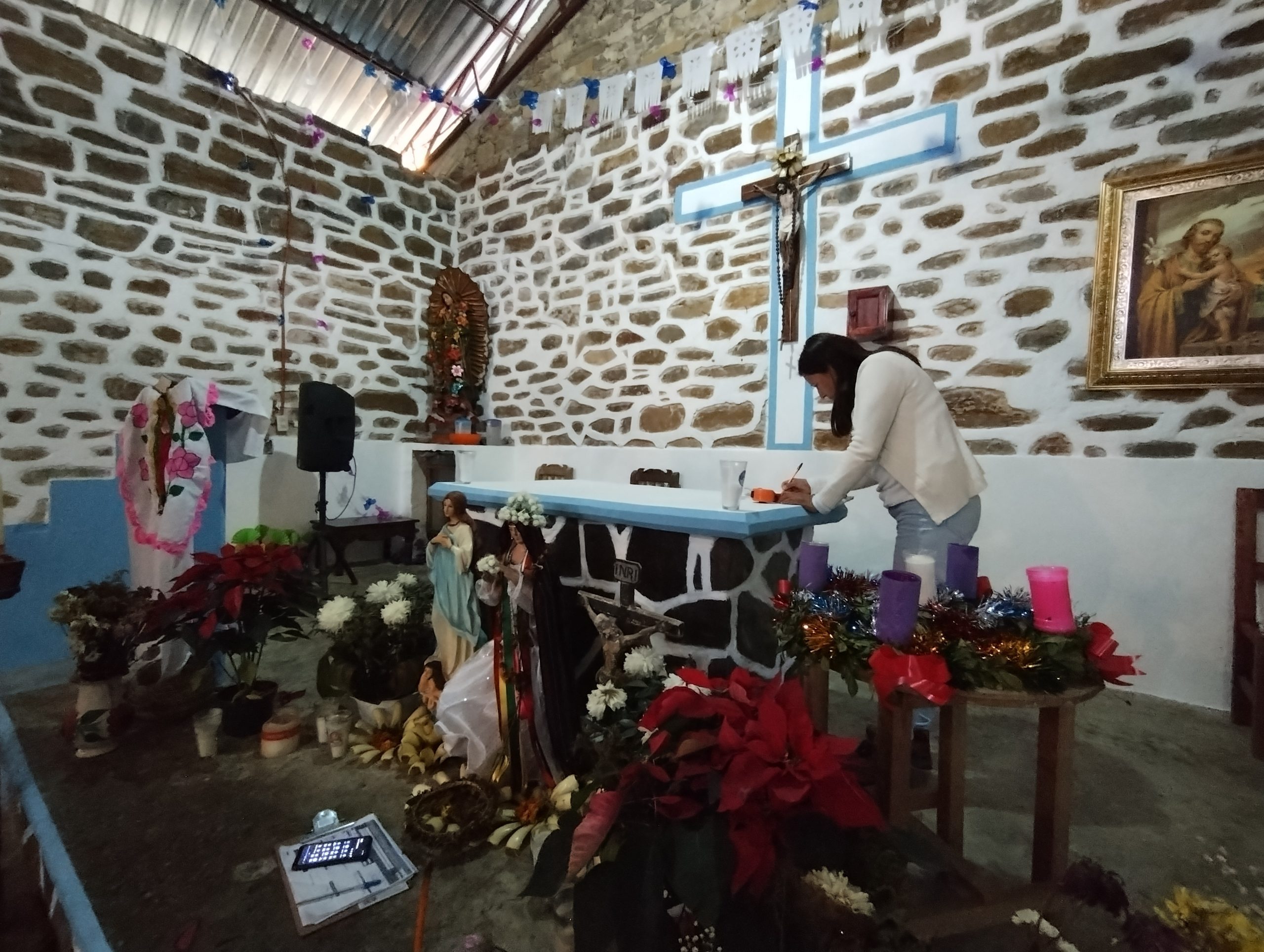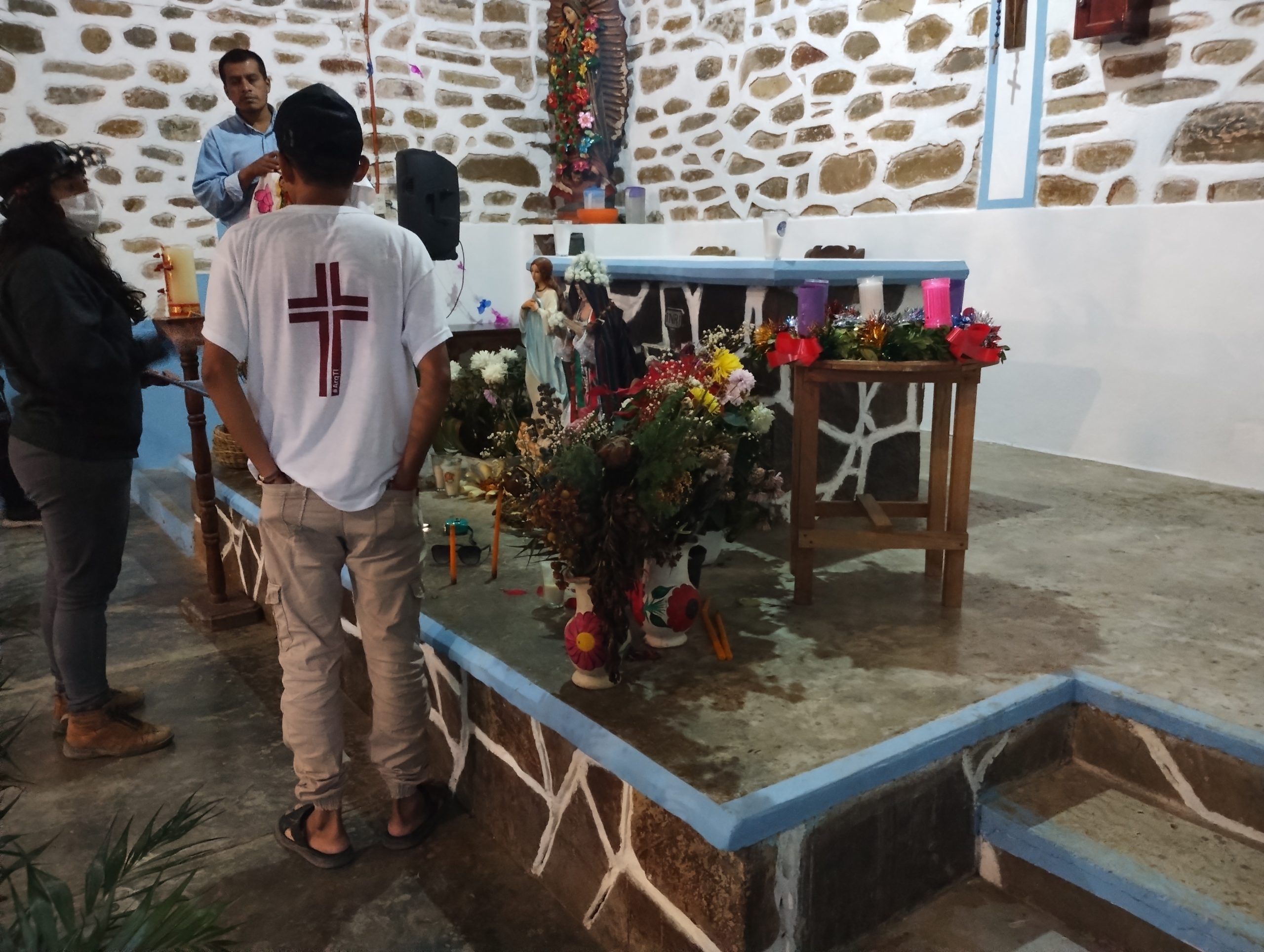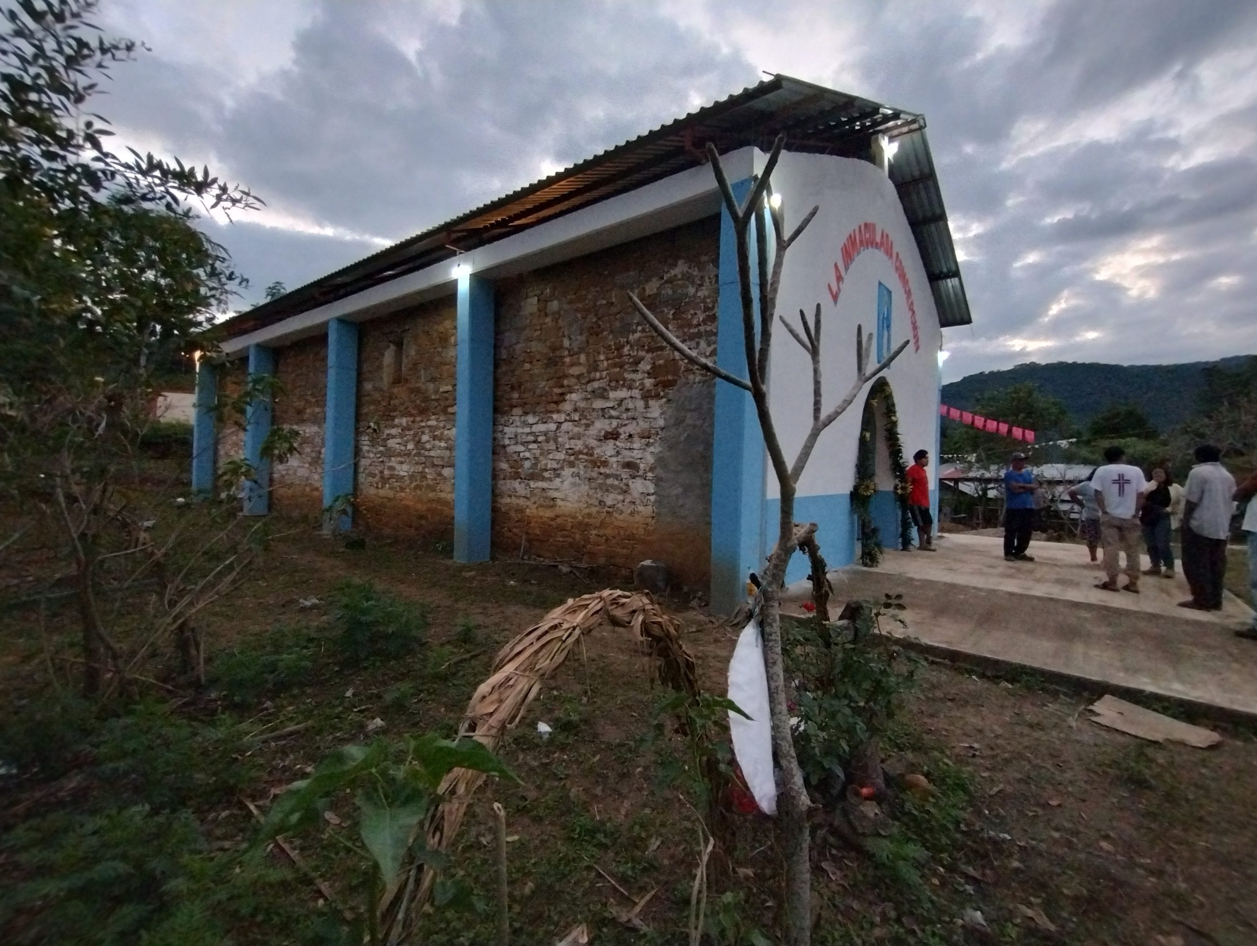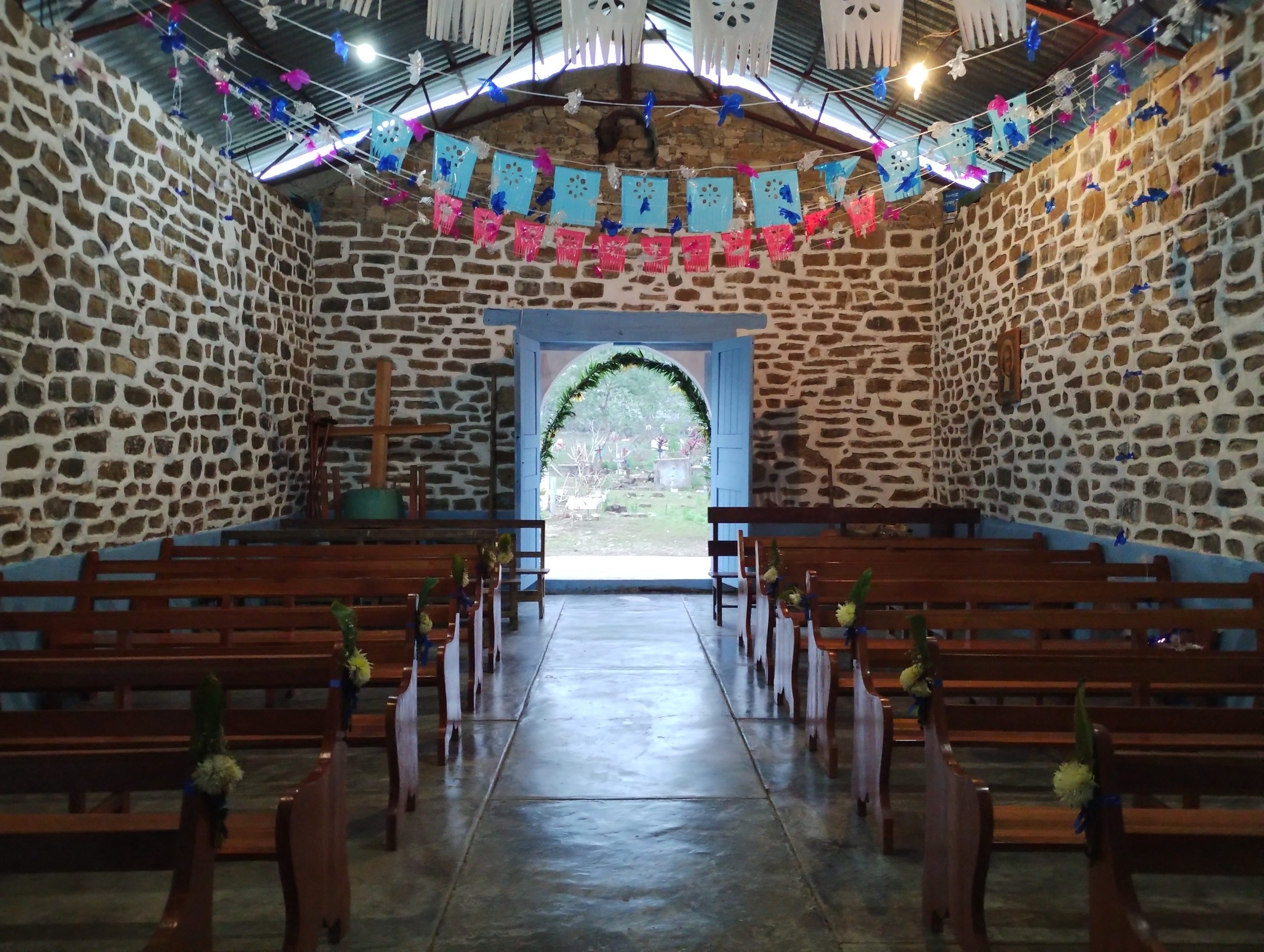 DESCRIPCIÓN ARQUITECTÓNICA. Su forma es una nave rectangular, sus muros perimetrales son de piedra de la region, su techado es de forma triangular (dos aguas), sus pisos son de concreto pulido color gris. En el año 2015 gente de la comunidad decidieron realizar unas columnas al exterior del templo, en ellas descansan unas armaduras de acero que son las que reciben las laminas galvanizadas. al exterior del templo se encuentra el campo santo (panteón).