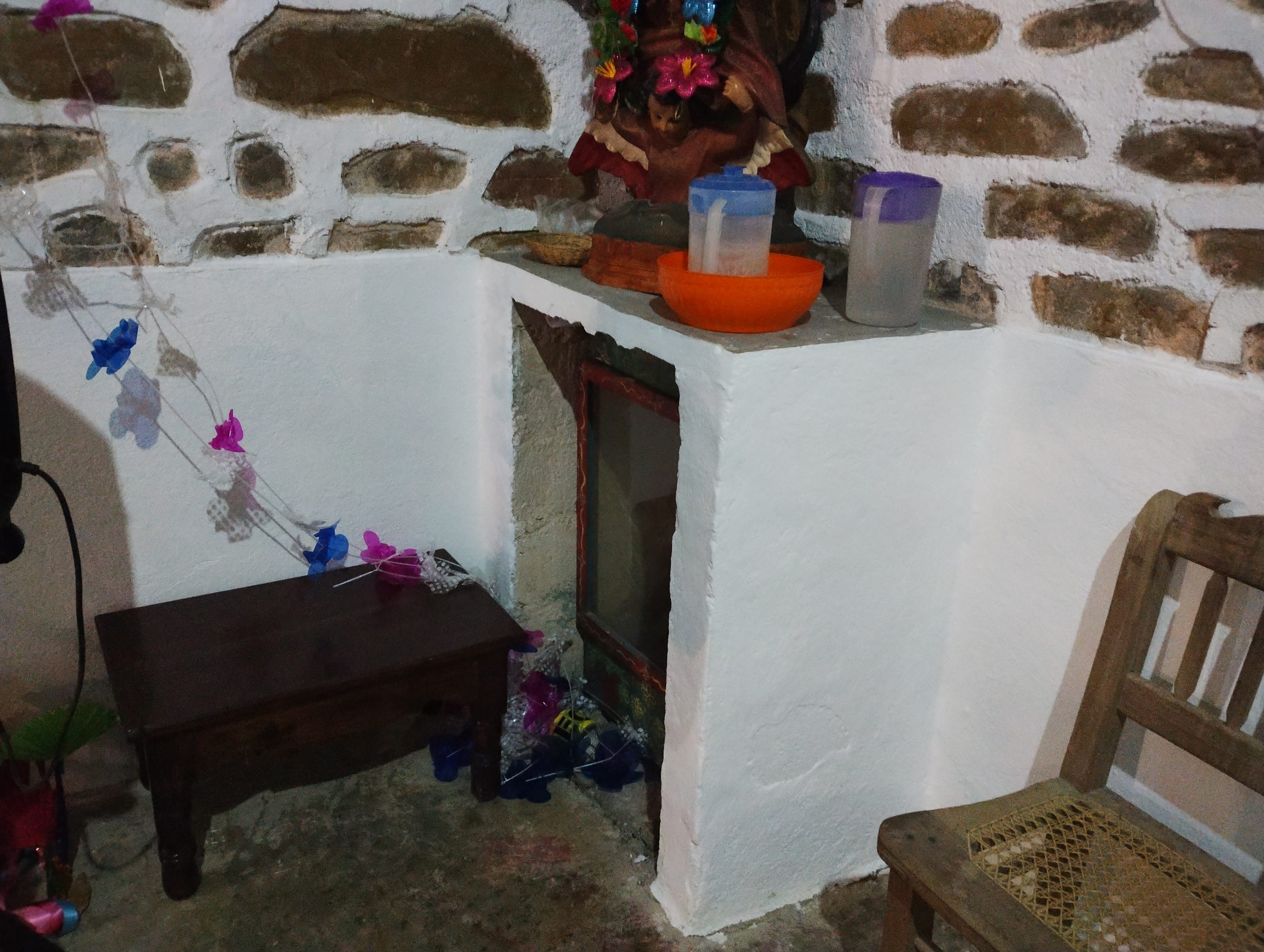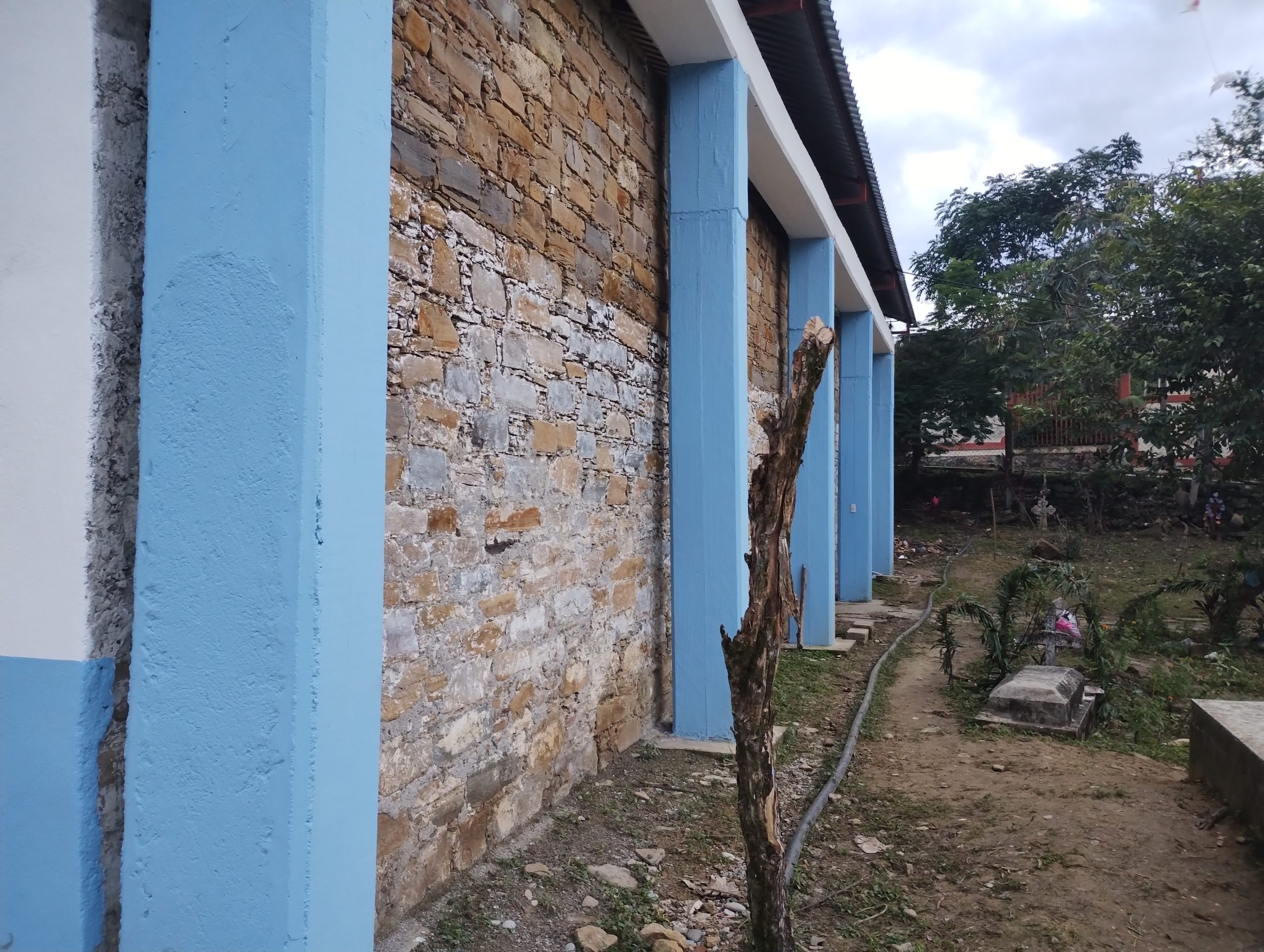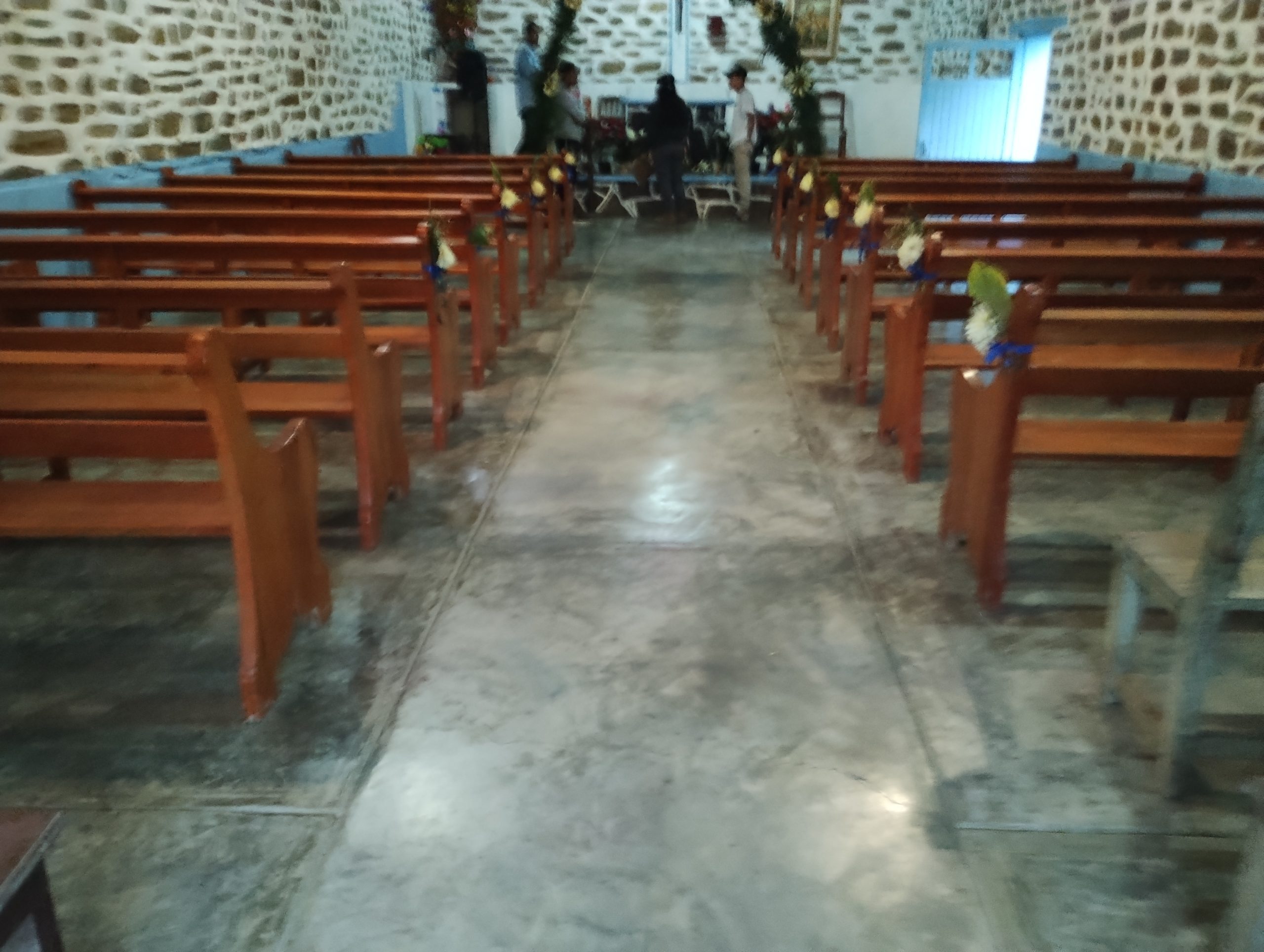 Información Oral : Es una capilla existente, en el patio exterior se encuentra el campo santo (panteón), la comunidad a tratado de mantener la originalidad, dando mantenimiento lo mas posible a su estilo, los muros son de piedra aparente, para evitar los desprendimientos de piedra han optado por hacerle las juntas de cemento, cal, arena, dejandolas visibles, anteriormente su techado era de teja sobre vigas de madera, debido a la filtracion de agua que existia y al deterioro de las vigas de madera, en el año 2015 la comunidad se organizo y decidieron construir unas columnas de concreto adosadas en la parte exterior del templo y sobre ellas descansa unas armaduras de perfil de acero formando un bastidor para recibir la lamina galvanizada, con esto han evitado que el agua pluvial dañe el interior del templo y su bienes muebles.